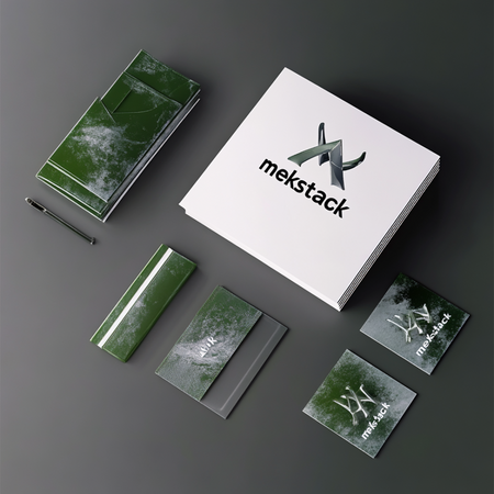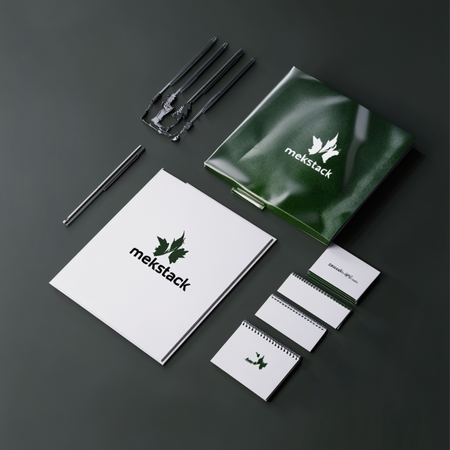 /imagine prompt image of mockup of printed materials (stickers, copybook, calendar, business cards) on a grey background for the clothing barnd called «mekstack». Metal textures and glossy green plastic textures --v 6.1