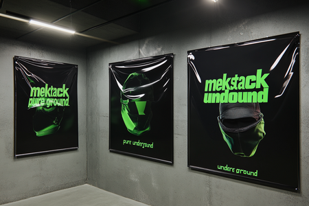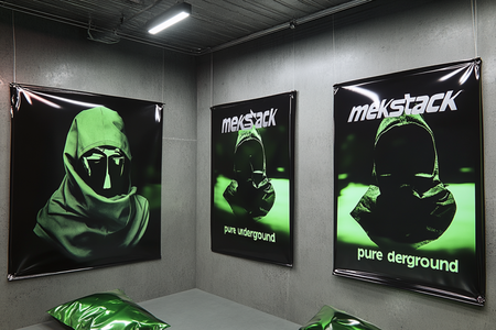 /imagine prompt image of three posters on the grey wall. The posters are made for the clothing barnd called «mekstack». Poster contains metal textures and glossy green plastic textures. Poster has image of the balaclava on it and a slogan «pure underground» --v 6.1