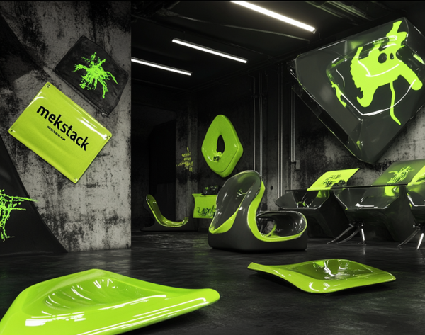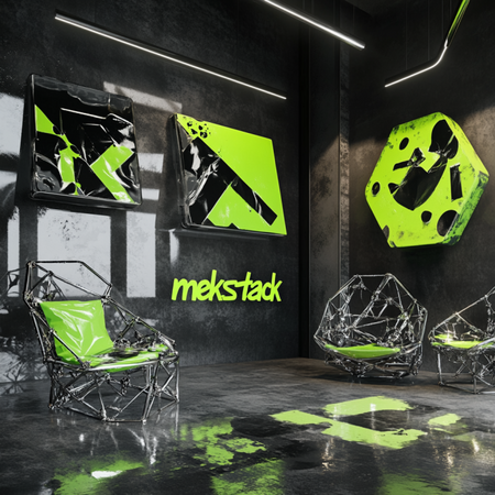 /imagine prompt image of the office environment of the underground clothing brand called «mekstack». Items in the office contain metal textures and glossy green plastic textures. Metal designed furniture with biological forms. Green graffities on the grey walls --v 6.1