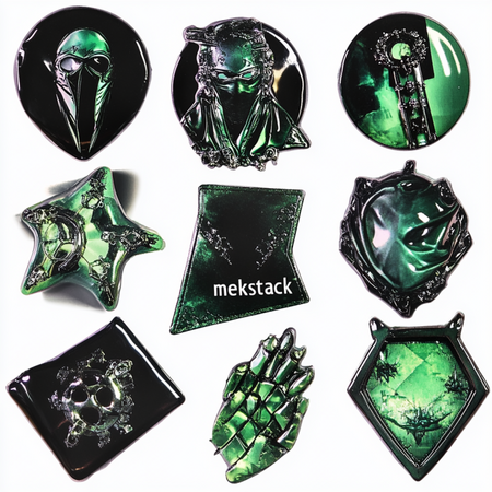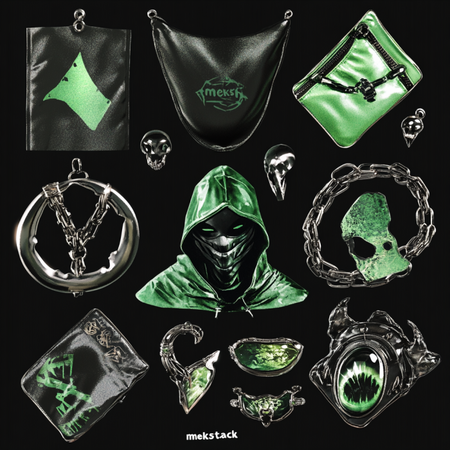 /imagine prompt image of the variety of stickers and jewelry objects. The stickers are made for the clothing barnd called «mekstack». Jewelry has bio and gothic forms. All items contain metal textures and glossy green plastic textures.They have images of the balaclava on it and metal abstract forms. All items are lying on the table. View from the side --v 6.1