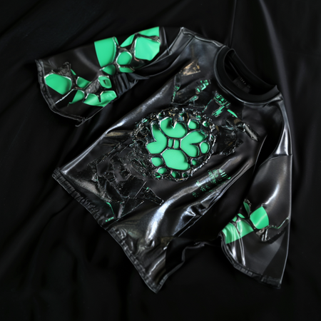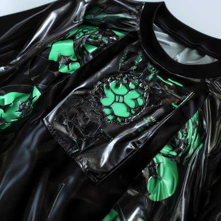 /imagine prompt image of the t-shirt. Items contain metal textures and glossy green plastic textures. Images of metal abstract forms on the T-shirt --v 6.1