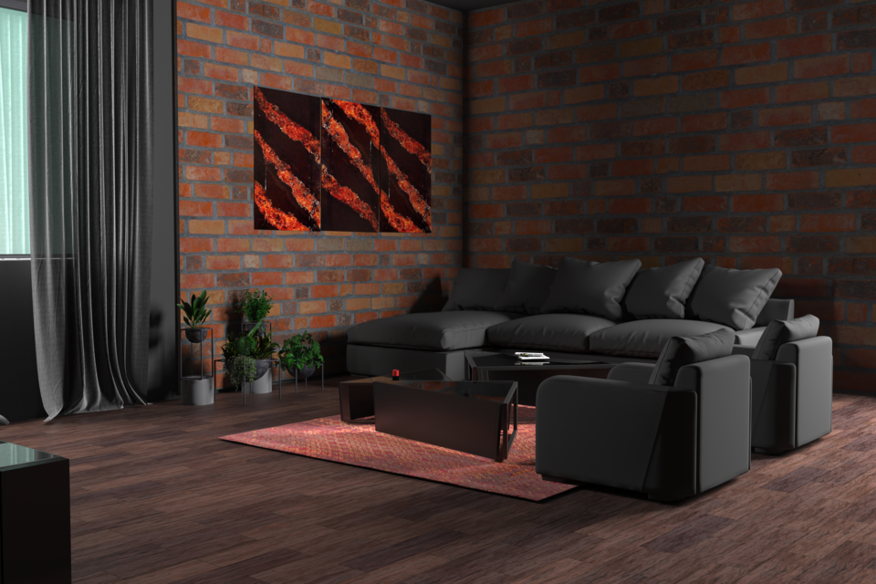 Общий колорит интерьера имеет темные тона. Цветовая палитра, состоящая из серого, черного, белого, темно-коричневого и акцент в виде ярко-оранжевого и красного оттенков. Присутствует много серых нейтральных тонов. Предпочтение отдано искусственным, цветам, это сделано для того, чтобы в пространстве интерьера чувствовалось некое напряжение. Стены отделаны декоративным бетоном в холодных серых тонах и имеют красивую шероховатость.