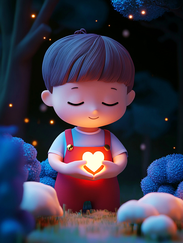 2. Midjourney: 3D rendering of a lively and colorful poster featuring an adorable boy holding his hand over his heart. The boy is wearing cute and adorable red overalls and a blue t-shirt. The boy has a glowing star in his hand. The boy has his eyes closed. There are blue trees in the dark background. The image has dark light blue and beige colors and only and only the warm light from a star illuminates the whole place. The overall design shows a Japanese aesthetic inspired by cartoon. The perspective is straight and close-up.