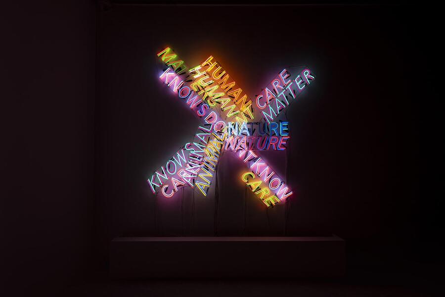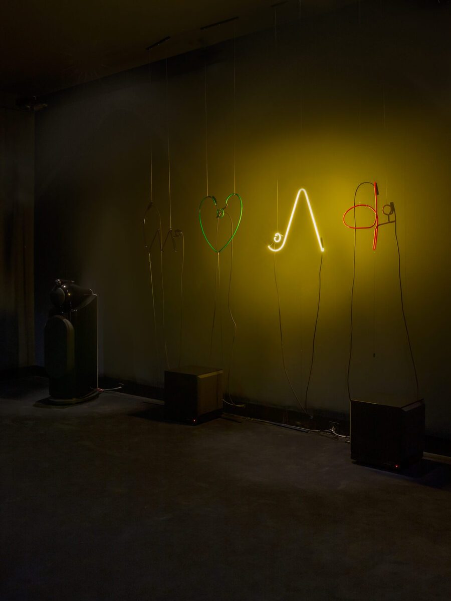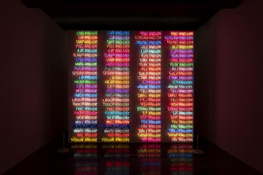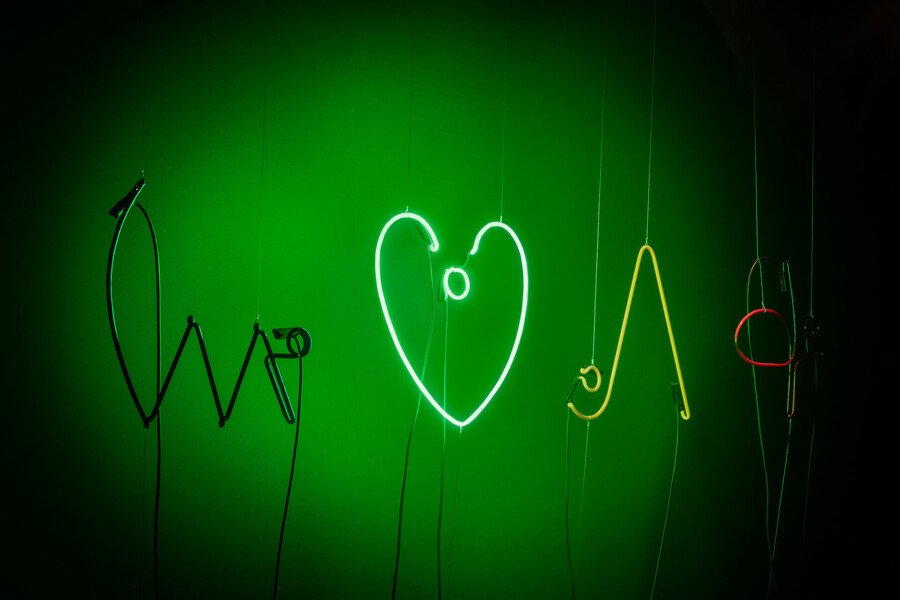 На выставке также представлены знаменитые неоновые скульптуры Наумана, которые исследуют способы, с помощью которых искусство может занимать пространство между рекламой и потребительством, а также потенциал языка и света. Такие работы, как «The True Artist Helps the World by Revealing Mystic Truths (Window or Wall Sign)» (1967), были вдохновлены рекламной вывеской пива, которая висела в его студии в Сан-Франциско, бывшем продуктовом магазине.
