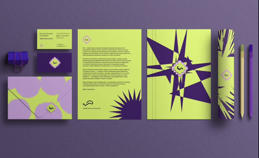 mj: Corporate stationery set with bold, abstract «LEE» logo, modern geometric design in bright lime-yellow and deep purple colors. Includes business card, letterhead, envelope, folder, and branded notebook, all featuring sharp spiky and jagged graphic elements inspired by the logo. Minimalist layout, high contrast, clean sans-serif typography, consistent use of the brand colors throughout all items. Items are arranged neatly on a matching purple background, showcasing a cohesive, creative, and visually striking brand identity.