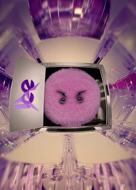 Runway: A futuristic chrome and glass box with an abstract purple «Lee» logo on the door, flying through a glowing high-tech tunnel. Inside the box sits a fluffy, round, angry pink character with expressive eyebrows, staring out. The camera starts close with a dramatic fisheye lens, then smoothly pulls away, revealing the box floating and spinning in zero gravity, surrounded by shimmering translucent structures and neon purple highlights. The perspective is dynamic and cinematic, with a sense of speed and depth, using a prolapse (reverse dolly zoom) effect. The overall vibe is surreal, bold, and ultra-modern, with motion blur, glowing reflections, and a strong contrast between soft, fuzzy textures and sharp, futuristic architecture. --video --cinematic --fisheye --zoom_out --prolapse --neon --high_contrast --masterpiece --ar 16:9