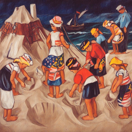 Итоговая серия изображений, созданных с помощью обученного LoRA-адаптера, демонстрирует характерный стиль Натальи Гончаровой в разнообразных сюжетах. В изображениях людей особенно ярко проявилось умение модели передавать крестьянские типажи в духе работ художницы. Особенно удачно нейросеть справилась с передачей характерных поз и жестов, заимствованных из народных танцев и обрядов, где динамика движения подчеркивается дроблением форм на угловатые фрагменты.