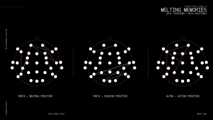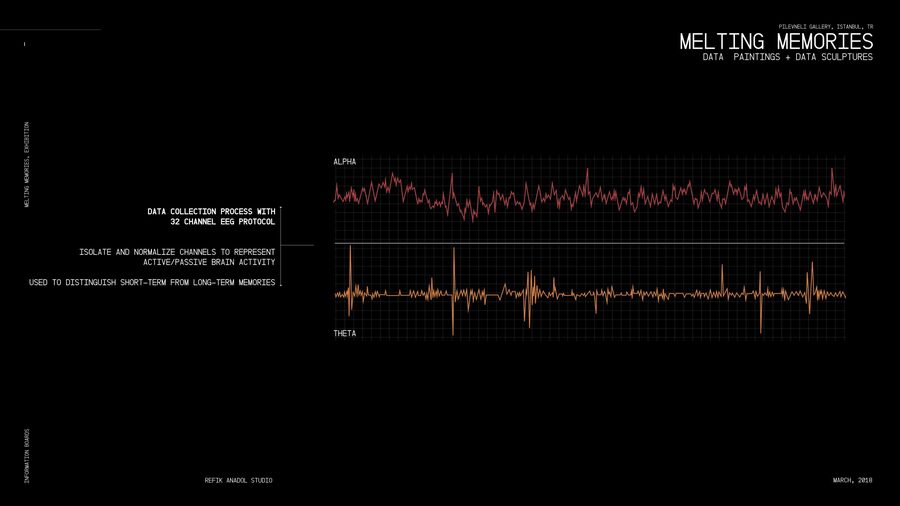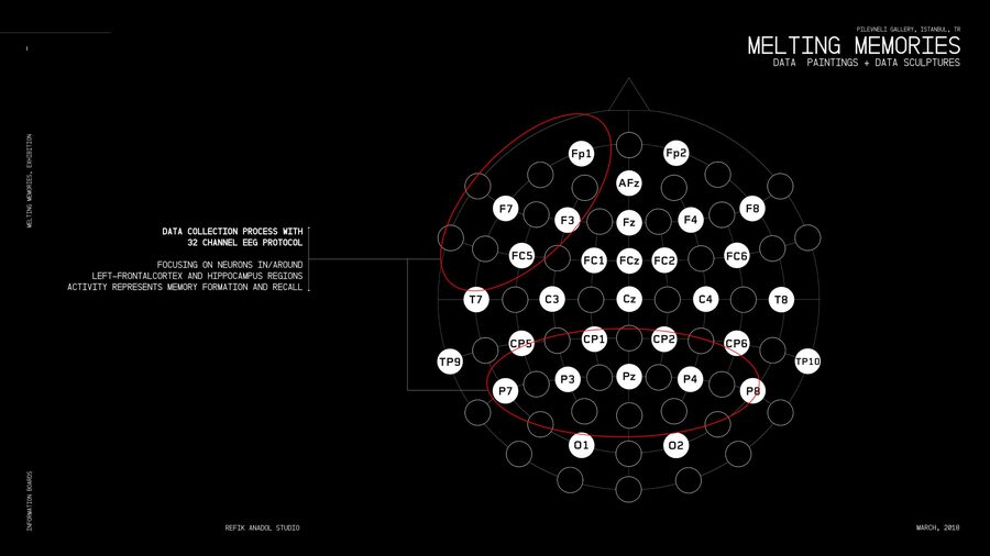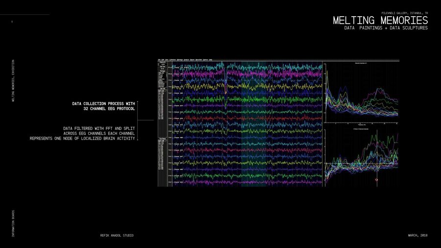 Для сбора данных Рефик Анадол использует 32-канальную ЭЭГ-систему, фиксирующую мозговую активность участников, вспоминающих конкретные эпизоды из жизни. Он анализирует волны в диапазонах бета и тета, фокусируясь на узлах, связанных с эпизодической памятью. Эти данные проходят очистку, фрактальный анализ и спектральную трансформацию с помощью нейросетей.