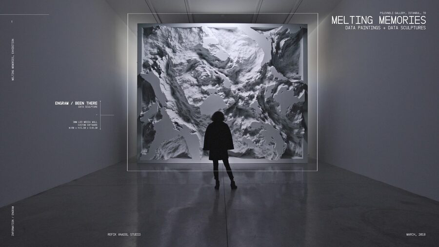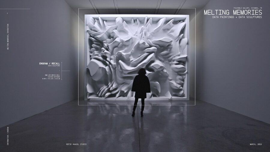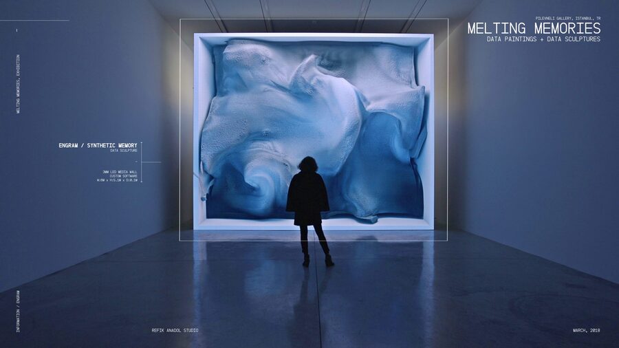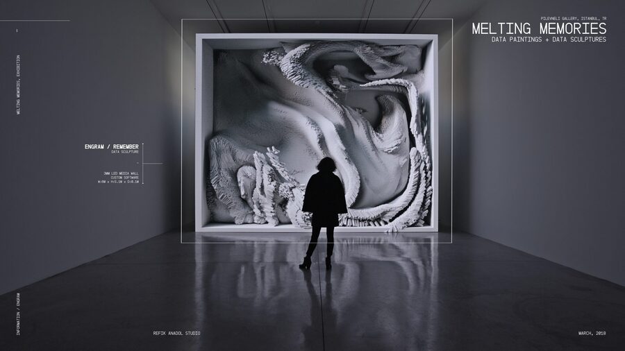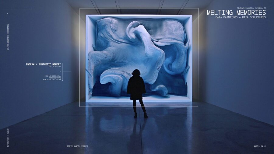 Melting Memories — это художественное исследование памяти, в котором Рефик Анадол превращает процессы извлечения воспоминаний в визуальные и пространственные образы. Инсталляция ставит перед собой вопрос: как можно представить внутреннюю, эфемерную работу мозга как материальное, осязаемое переживание?