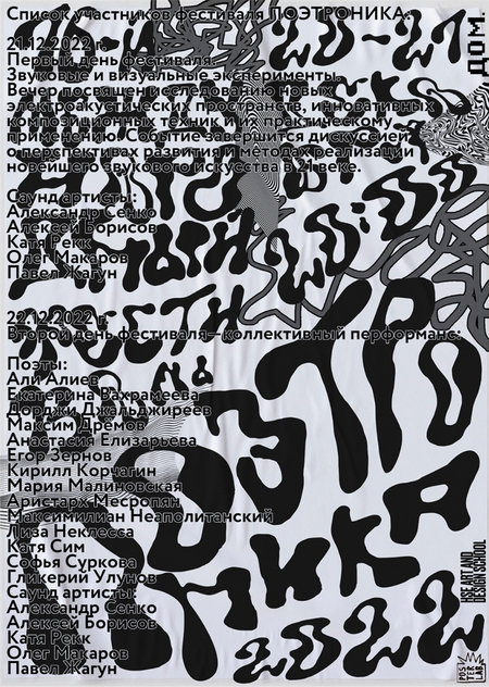 This is the 16th International Festival of Poetronic 2022, dedicated to modern poetry, soundart and video art. That’s where we put the posters. For the first, we specifically designed the font on the basis of a random figure. The font was tedious, moving from one form to another, to show a merger of two creative areas, poetry and electronics. And here’s a second poster made of scotch without a sketch.