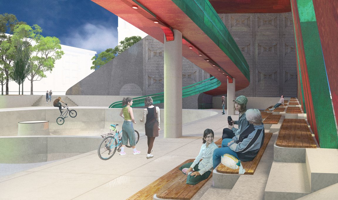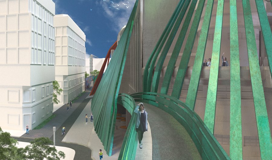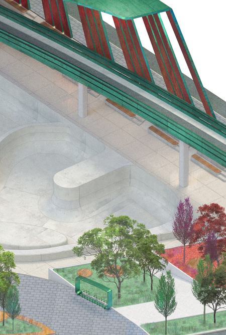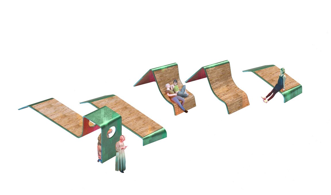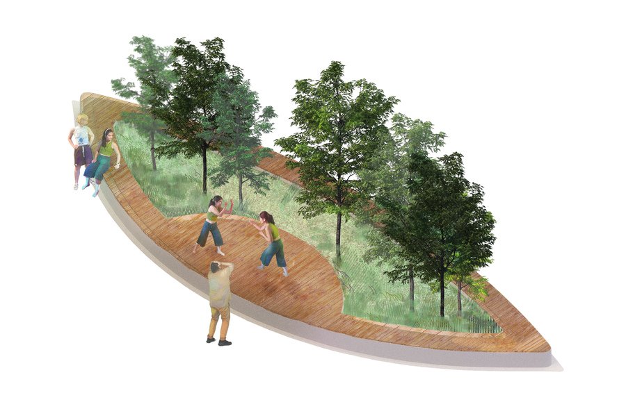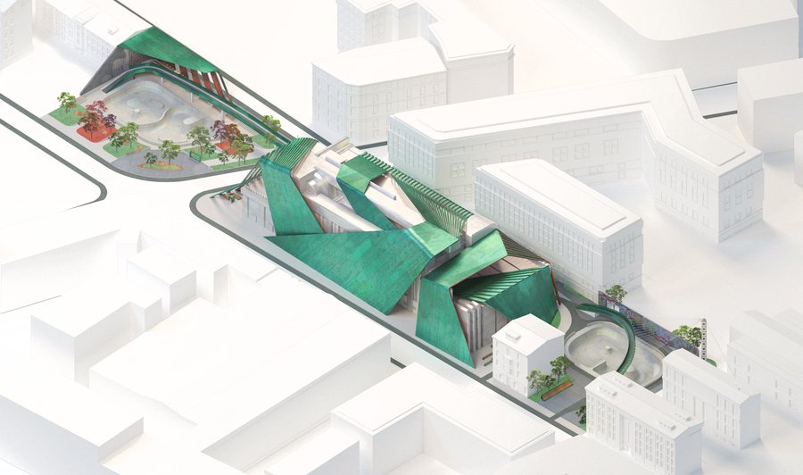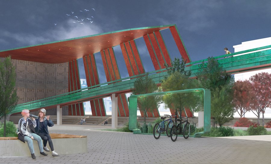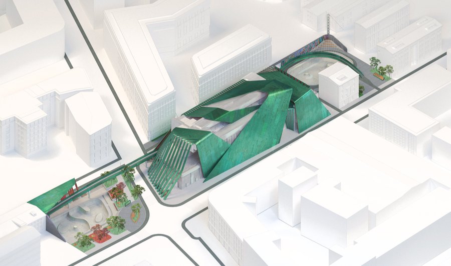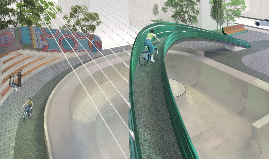 Формообразование парка объединяет в себе ритмы орнаментов Степановой, пластику металлических лент фасада Красного Знамени и плавные формы вело-парков.