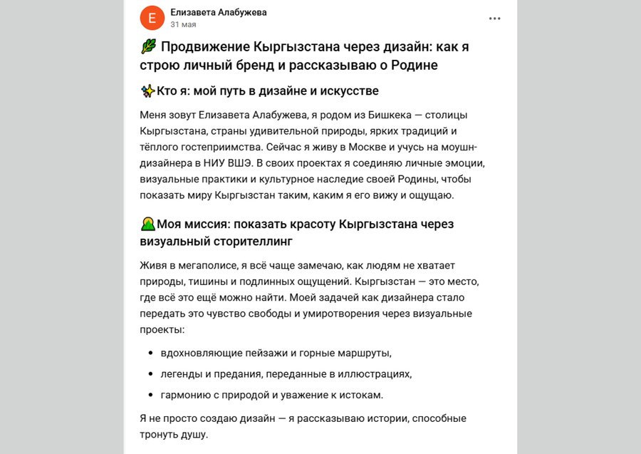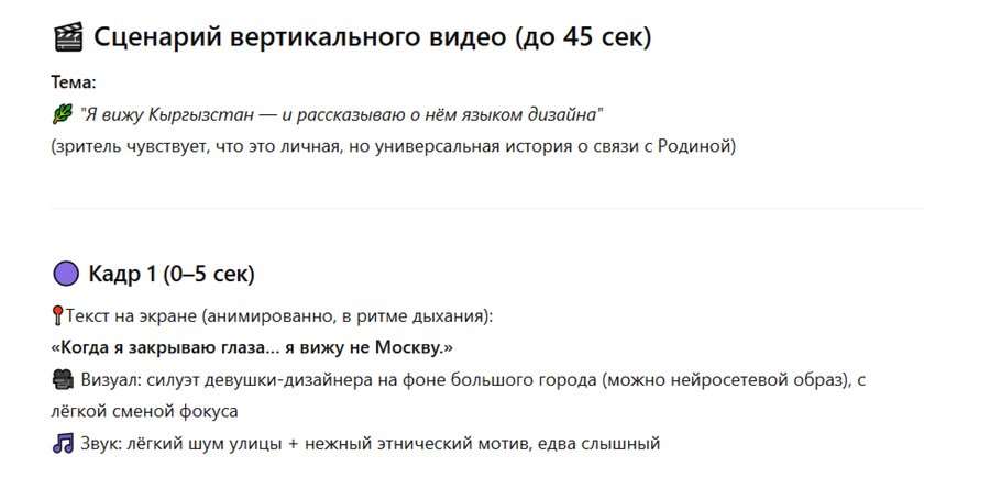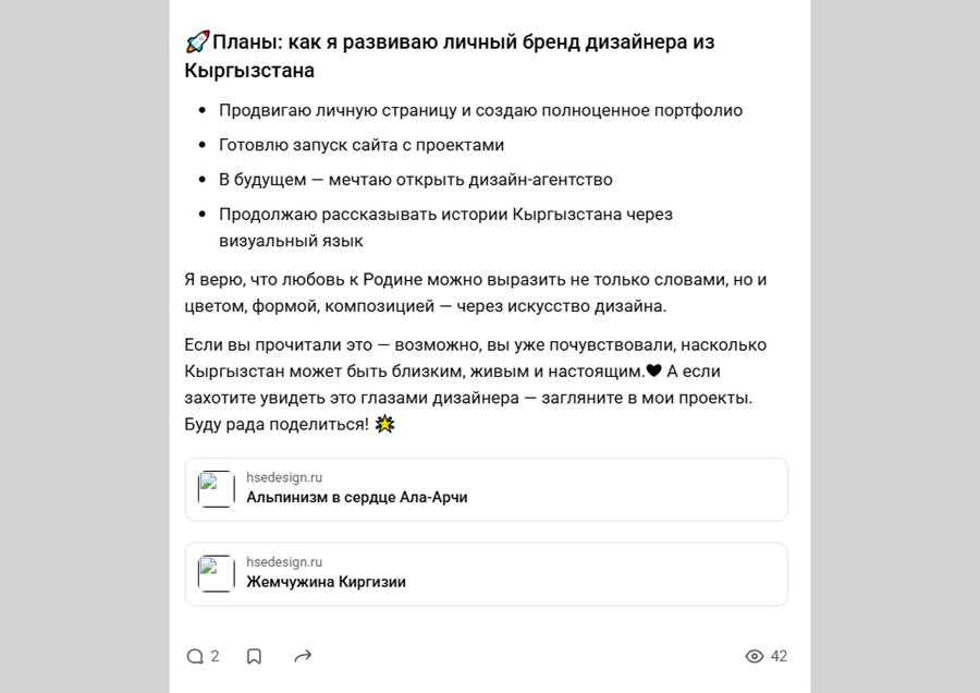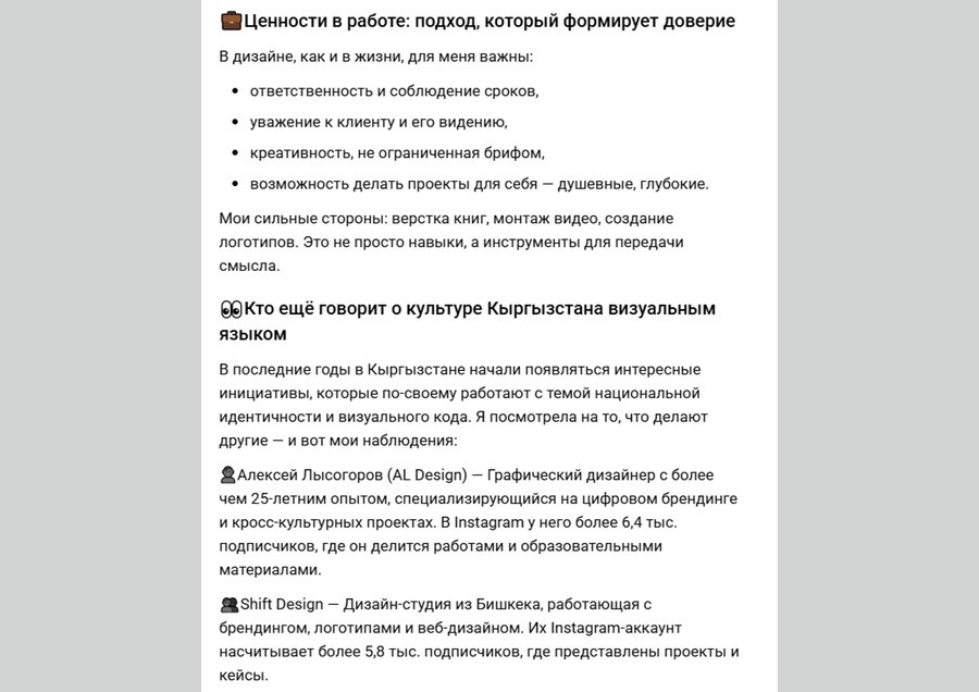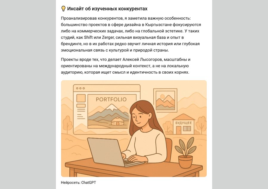В рамках продвижения также был проведён анализ конкурентов через Perplexity — это помогло выделить уникальные черты проекта и отличия от других визуальных инициатив, связанных с культурой Кыргызстана. В результате, статья не только рассказывала о дизайне и Родине, но и становилась частью широкой дискуссии о визуальной идентичности в постсоветском пространстве.