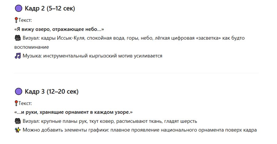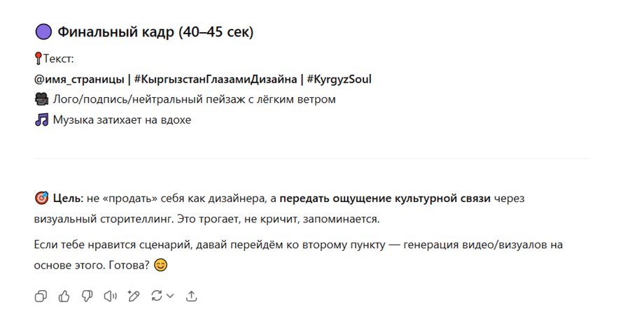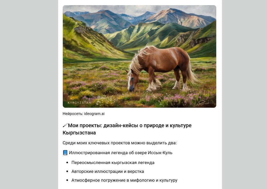 Для поиска и анализа конкурентов применялась нейросеть Perplexity, которая помогла выявить актуальные визуальные практики, темы и стилистические подходы в смежных проектах. Это дало возможность точнее позиционировать свой контент и выделить уникальные особенности визуального нарратива, связанного с культурой Кыргызстана.