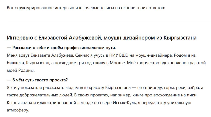 Публикация была создана с помощью последовательной работы с ИИ-ассистентом по методике самоинтервью: этап за этапом я формулировала суть проекта, анализировала свои сильные стороны, определяла цели и ценности. Такой подход позволил не только структурировать материал, но и выстроить личный нарратив, в котором сочетаются культурная идентичность и дизайнерское мышление.