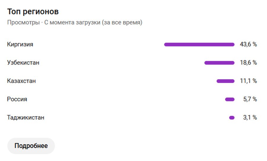 География просмотров подтверждает локальную идентификацию проекта: 43,6% просмотров пришлись на Кыргызстан, 18,6% — на Узбекистан, остальная часть трафика — на другие страны СНГ. Также значимым фактором стало поведение пользователей по типу устройств: 86,2% просмотров были с мобильных телефонов, 6% — со Smart TV и 4,8% — с компьютеров. Это подчёркивает, что контент успешно адаптирован под мобильное потребление и визуальные решения хорошо сработали на маленьком экране.