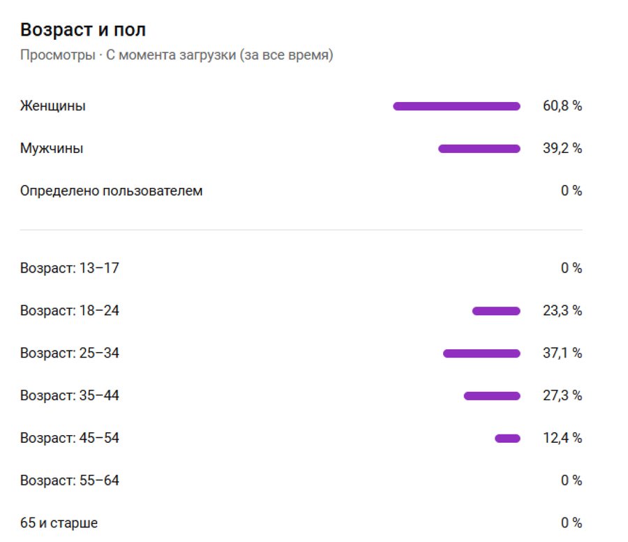 Аудитория ролика оказалась чётко очерченной по демографическим признакам: 60,8% зрителей — женщины, 39,2% — мужчины. Основной возрастной сегмент — молодые взрослые: 37,1% зрителей в возрасте 25–34 лет, 27,3% — от 35 до 44 лет, 23,3% — от 18 до 24 лет. Таким образом, видео нашло отклик у зрелой, заинтересованной аудитории, способной к восприятию культурного и визуального контента.