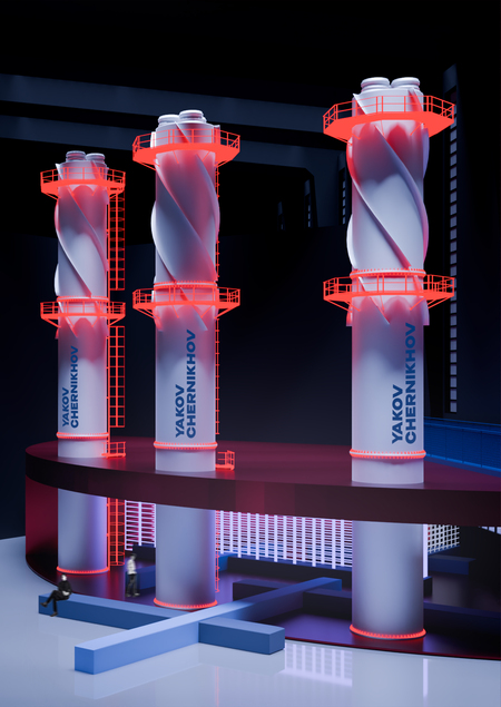 3 эмоциональная точка, в которую зритель попадает из зоны отдыха проходя через коридор. Здесь его взору раскрывается кульминация экспозиции, в которой представлены элементы завода, которые светятся в пронзающем мраке, а также главный элемент выставки — инициалы фамилии великого Архитектора Якова Георгиевича Чернихова, который мечтал, проектировал и создавал миры Утопии.
