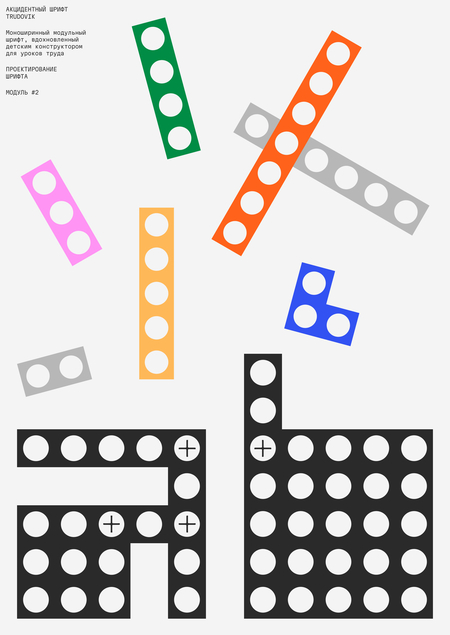 Моноширинный модульный шрифт, вдохновленный детским конструктором для уроков труда.