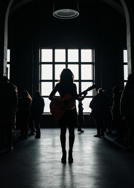 Обложка сгенерирована в нейросети Ideogram Промт: A silhouette of woman with guitar playing in front of public inside the dark building with bright contrast light, photo