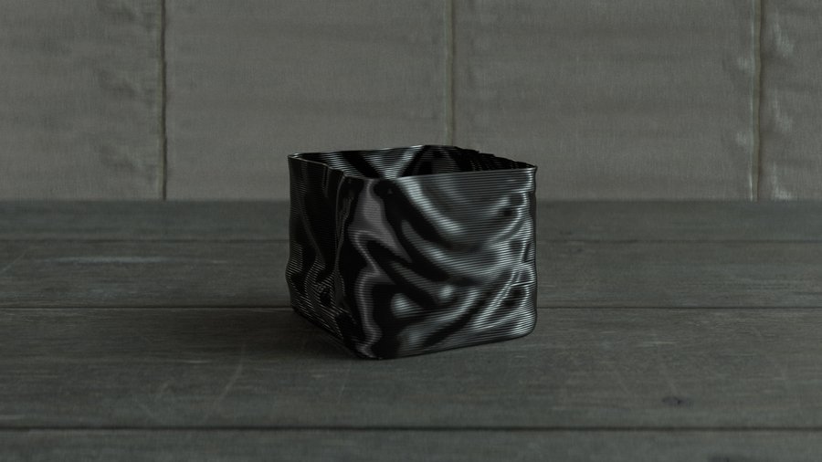 Эффект драпированной текстуры достигается за счет использования симуляции сжатия и сминания ткани на этапе моделирования моделей. Благодаря процедурным возможностям программы Houdini, каждая ваза имеет свою уникальную форму