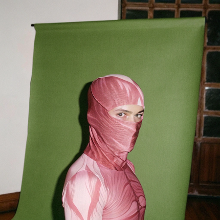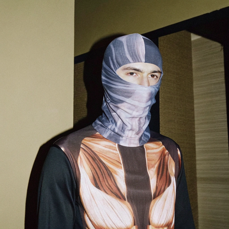 «Create a product photography image of a balaclava for a clothing catalog, with a realistic print of a 3d render of muscles. The balaclava should be worn by a model, covering their entire face except for their eyes. The muscles print should be visible on the front of the balaclava, covering the whole item, and the background should be a solid color. The image should have a high resolution and be suitable for use in a catalog or on a website, neutral colors.»