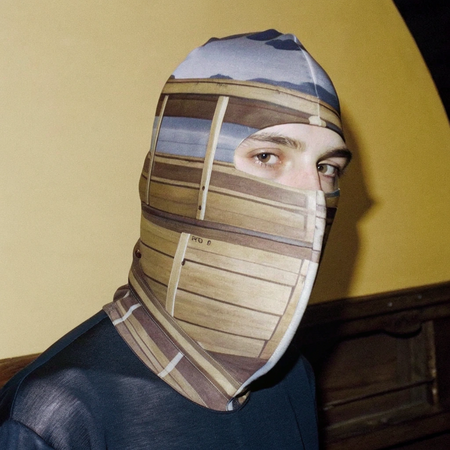 «Create a product photography image of a balaclava for a clothing catalog, with a realistic print of a 3d render of a wooden ship frame. The balaclava should be worn by a model, covering their entire face except for their eyes. The wooden ship print should be visible on the front of the balaclava, and the background should be a solid color. The image should have a high resolution and be suitable for use in a catalog or on a website, neutral colors.»