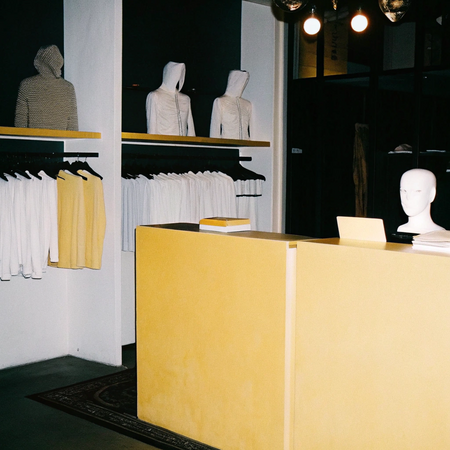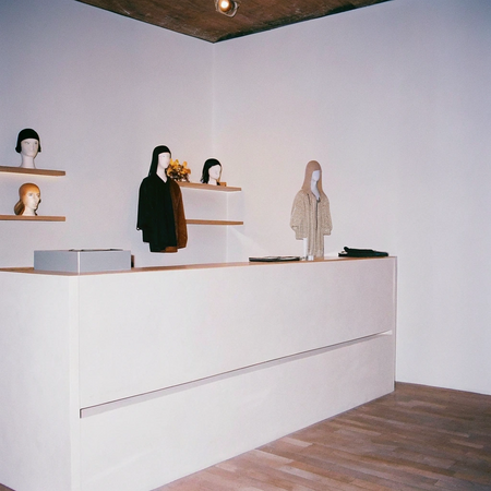 «Interior design of a minimalistic store dedicated to selling balaclavas. The space features a sleek and modern layout with clean lines and neutral tones like white, beige, and gray. The walls are decorated with subtle textures or light wood panels, and the floor is polished concrete or light wood. Balaclavas are displayed on minimalist shelves, floating racks, and artistic mannequins arranged creatively to highlight their design. Soft, focused lighting creates a warm and inviting atmosphere, emphasizing the products. The store includes a small, unobtrusive counter with a modern cash register and minimal decor, ensuring a clean and sophisticated aesthetic.»