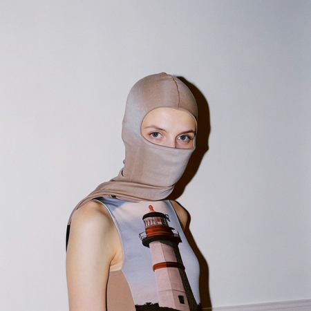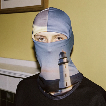 «Create a product photography image of a balaclava for a clothing catalog, with a realistic print of a 3d render of a lighthouse. The balaclava should be worn by a model, covering their entire face except for their eyes. The lighthouse print should be visible on the front of the balaclava, and the background should be a solid color. The image should have a high resolution and be suitable for use in a catalog or on a website, neutral colors.»