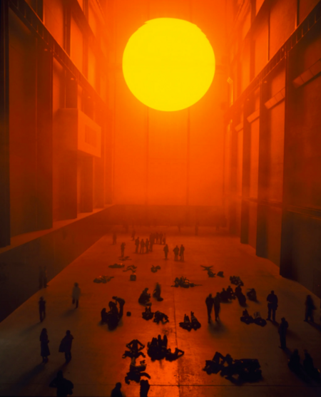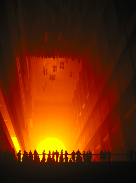«Проект погоды» Олафура Элиассона, представленная в Тейт Модерн, — это одна из самых известных инсталляций современности, которая использует свет и атмосферу для создания ощущения неопределённости и психологического воздействия на зрителя. Центральный элемент работы — искусственное солнце, которое воссоздаёт атмосферу природного света, но с элементами неестественности. Большое пространство, наполненное туманом и насыщенным золотистым светом, создаёт эффект, в котором зритель теряет чувство времени и пространства, ощущая себя маленьким и беззащитным в этом огромном искусственном мире. Эта инсталляция вызывает у зрителей чувство сущности атмосферных явлений, что не оставляет их равнодушными.