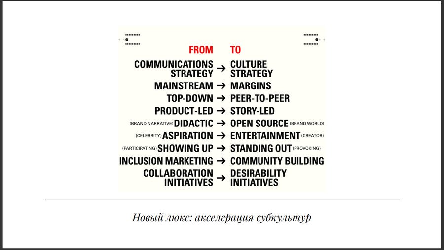 По наблюдениям спикера проблема старого люкса заключается в том, что у него есть свои трендсеттеры. Те, кто носил этот люкс раньше сформировали определённый образ, с котором новое поколение не хочет себя ассоциировать.