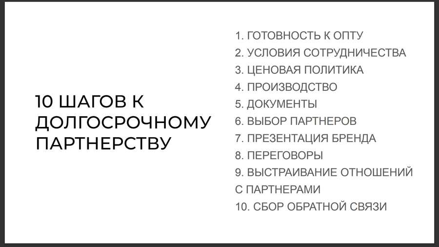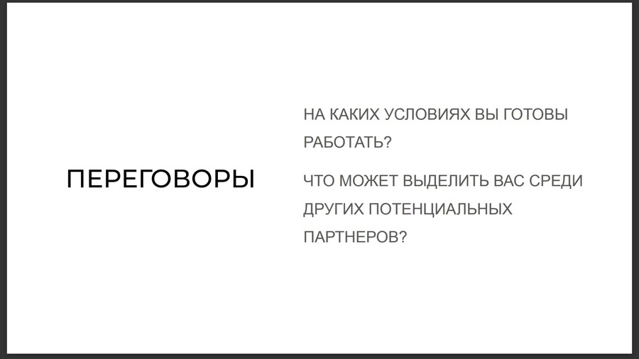 Важный этап любого сотрудничества — переговоры. Добиться долгосрочного партнёрства бывает сложно, поэтому часто бренды не хотят долго договариваться об условиях, а зря: «Если вы предложите наиболее выгодные условия, вас точно запомнят. Это возможность для вас получить те условия, на которых вы реально сможете работать, а не ради какого-то партнёрства».