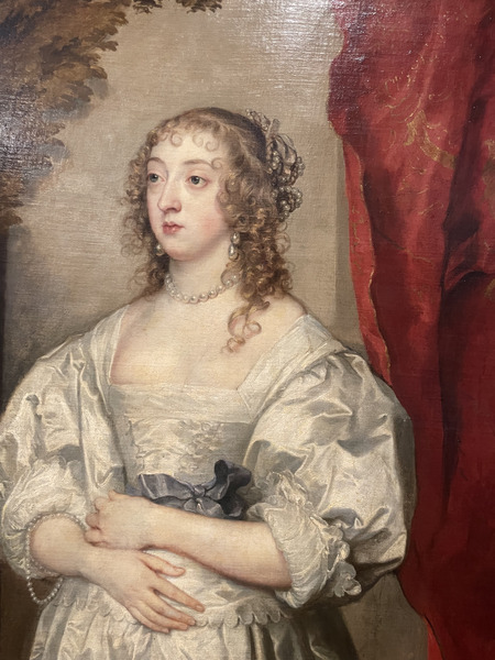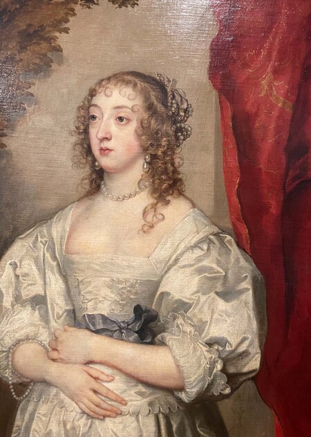 Не зная истории этого полотна, можно предположить, что дама слева более обеспеченная, так как ее наряд увешан жемчугом и сделан по всем канонам актуальной моды 17 века. Мы можем понять, в каком веке жили героини лишь по их наряду — в 17 веке была модной конструкция корсета, как у графини Портленд. Однако наряды героинь выявляют не только их приверженность моде, но и дополняют образы, эмоции. На лице Катерины Говард читается ее смущение, ступор, она будто «побелела» и, действительно, она более бледная, чем румяная и улыбчивая графиня Портленд. Это делает картину несколько тревожной — будто бы зритель чувствует, что между дамами есть нерешенное дело или конфликт. Довольно символичную роль здесь играют красные шторы, как знак конфликта, противодействия. Картину делают тревожными деревья и кусты, а также штора, развевающиеся от ветра. В целом, атмосфера картины выглядит довольно мрачно, Катерина Говард стоит в «закрытой» позе. будто смущаясь графиню Портленд.