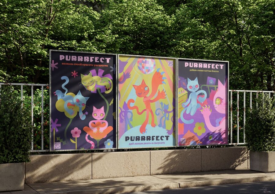 Эстетика плакатов PURRFECT NAILS была воссоздана сс помощью Ideagram и Leonardo.ai.