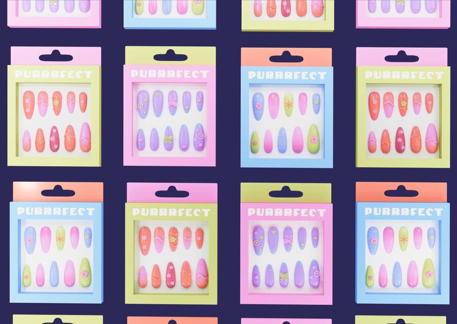 Промпт: Design a vibrant and eye-catching set of press-on nail tips featuring a colorful groovy design that embodies fun and creativity. Incorporate a variety of unique shapes and lengths to make each nail tip visually interesting and appealing. Utilize a bold color palette that includes shades of pink, orange, neon green, purple, and blue, ensuring that the colors are bright and lively. Consider incorporating playful patterns, such as swirls, polka dots, or abstract designs, to enhance the groovy aesthetic and make each nail tip a statement piece.The packaging for the nail tips should be equally captivating, prominently displaying the brand name 'PURRFECT NAILS' in a fun, whimsical font that complements the overall design. The packaging should reflect the vibrant colors and playful theme of the nail tips, making it an attractive choice for customers looking to express their individuality.