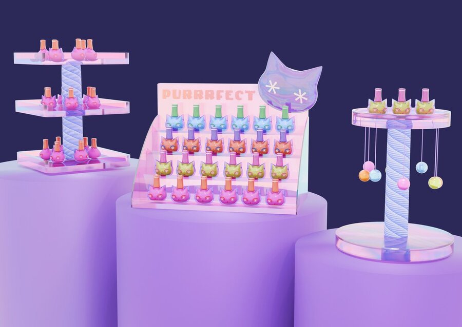Промпт: Design an engaging concept for a brand store dedicated to selling PURRRFECT nail polishes, crafted to captivate a trendy teen audience. The interior boasts a vibrant and groovy atmosphere, featuring plush flower-shaped pillows and a kaleidoscope of colorful chairs that invite visitors to relax. Displays of nail polish bottles designed as charming little cat heads take center stage, radiating fun and creativity. The bright, neon lighting energizes the space, while holographic shelves highlight an array of press-on nail tips and adorable cat figurines serving as playful mascots. Overall, the store embodies a whimsical, fashionable environment that encourages exploration and self-expression.