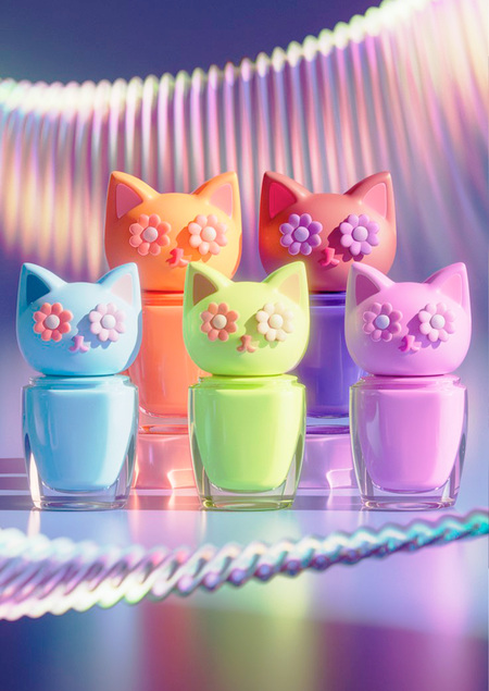 Промпт: Create a vibrant promotional photo featuring nail polish bottles with a brand name «PURRRFECT NAILS» designed as adorable little cat heads, each adorned with whimsical flower-shaped eyes. The bottles showcase a dazzling array of neon and saturated colors, including light blue, orange, neon green, pink, and purple. The scene is enhanced by shimmering holographic light rays that add a playful and magical ambiance, making the products stand out in an eye-catching way.