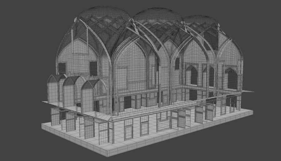 Еще одним примером отражения реальных исторических интерьеров в 3D является работа Хамида Хадиди. В 2017 году он выполнил проект по цифровизации дворца Чехель-сотун, памятника персидской архитектуры XVII века, находящегося в Иране. 3D-визуализация дворца была полностью выполнена в программе 3D-моделирования Blender, а текстуры сделаны при помощи использования фотографий с росписями внутри. Полная версия проекта представляет собой VR-погружение с возможностью изучить архитектуру и роспись дворца.