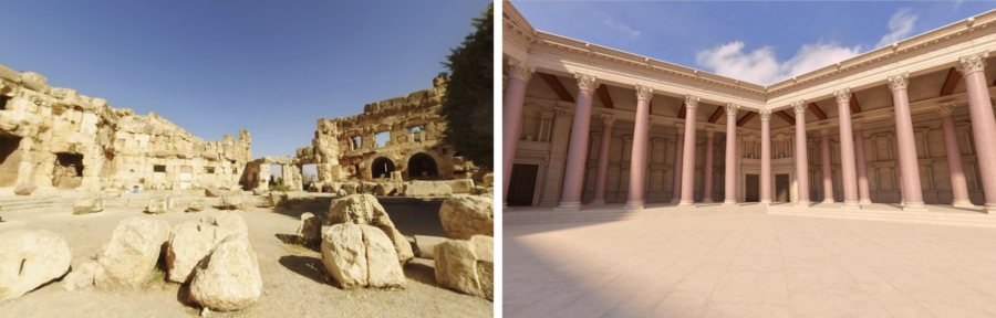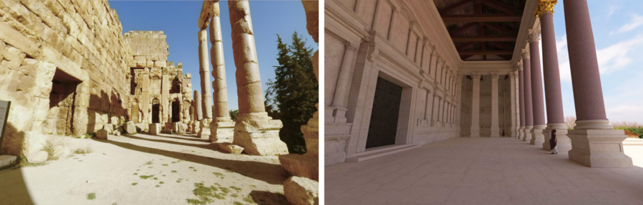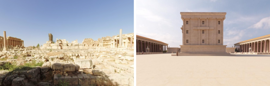 Храмовый комплекс Баальбек. Слева: фотографии, настоящее время. Справа: 3D-реконструкция, 2024 г.