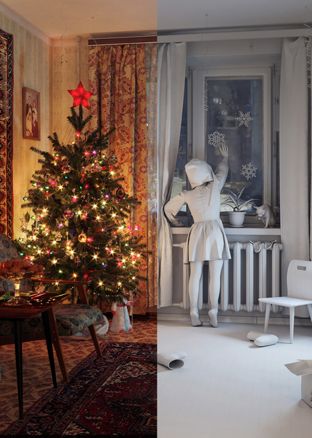 Атмосфера праздника подчеркнута с помощью трех источников света в сцене: гирлянды, лампы и телевизора — они выставлены таким образом, что получается классическая схема освещения, в которой два теплых источника контрастируют с одним холодным.