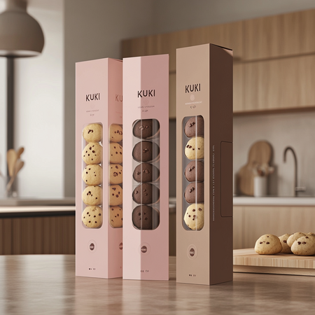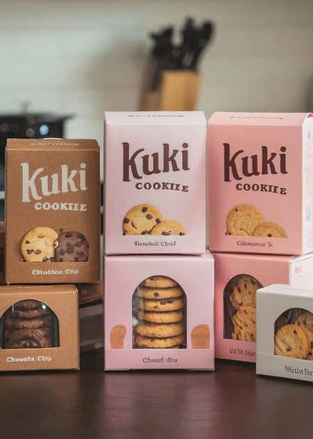 /imagine prompt: imagine a packaging in brown and pinkish color palette for KUKI cookie brand. it looks like an elongated box full of cookies. the packages for different tastes are different colours (brown, pink, vanilla). the background is a table in kitchen.