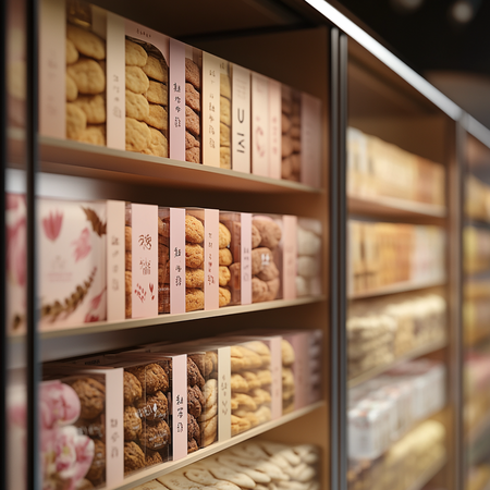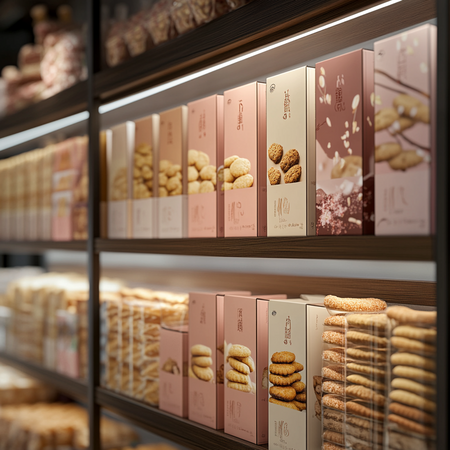 /imagine prompt: a packaging in brown and pinkish color palette for KUKI cookie brand on store shelves. it looks like an elongated box full of cookies. the packages for different tastes are different colours (brown, pink, vanilla).