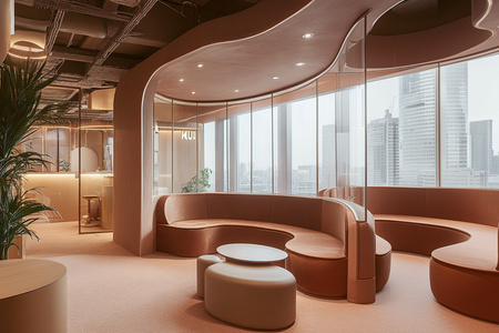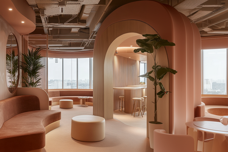 /imagine prompt: create an interior of the office building of a KUKI cookie brand in brown and pinkish color palette. there is a working and at the same time warm atmosphere.