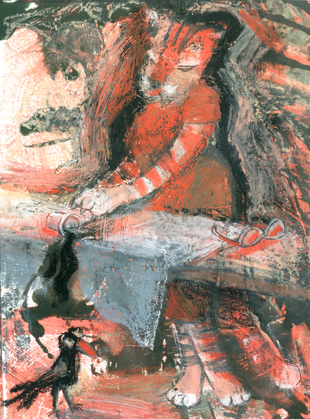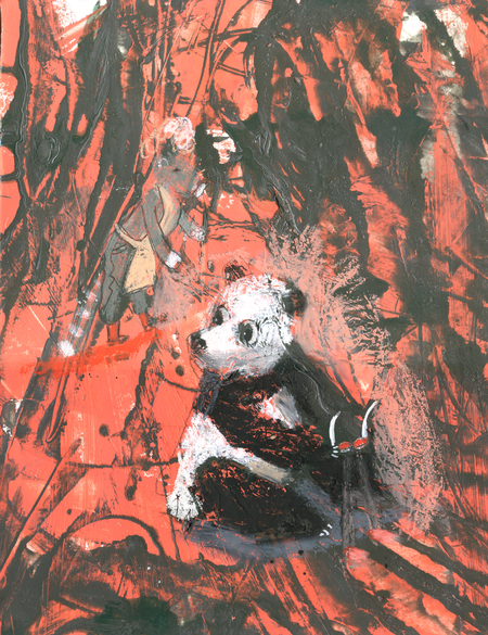 Графическая серия проявляет хаос беспомощного восприятия пространства, когда привычная фокусировка зрения потеряна персонажем. Через фактуры и неровное нанесение краски просвечивают образы непонятного и большого целого, на фоне которого фигуры животных локальны и как будто замерли. Это экспериментальный подход к материалу и композиции, для которого все листы серии были разрезаны из одного большого, хаотично заполненного двумя красками разной текстуры. Главный персонаж, тигробабушка отделена от своих очков, а значит и от привычного миропорядка.