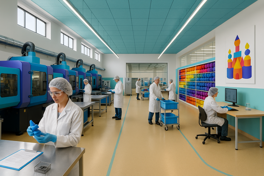 Промт: High-resolution industrial toy factory interior, 16:9, eye-level wide shot, professional yet friendly. Clean bright daylight from clerestory windows + long linear LED fixtures. LEFT: a row of blue/teal injection-molding machines with transparent doors and stainless hoppers, stainless worktables and gray rolling bins. CENTER: open aisle with a subtle cyan guide line on a sand-beige matte epoxy floor. RIGHT: long rainbow yarn shelf (spools sorted by hue) and a simple geometric castle poster on the wall. Wood desk with monitor for QA. PEOPLE: several adult workers in white lab coats, hair nets, safety glasses, blue nitrile gloves; one inspecting a molded cyan part at the front-left table, one pushing a blue tote cart center-right, one seated at the QA desk, plus 2–3 workers in the background. BACK: glass partition into a secondary room. Materials and style: ultra clean, realistic textures, rounded safety corners, organized layout, no clutter, soft shadows.