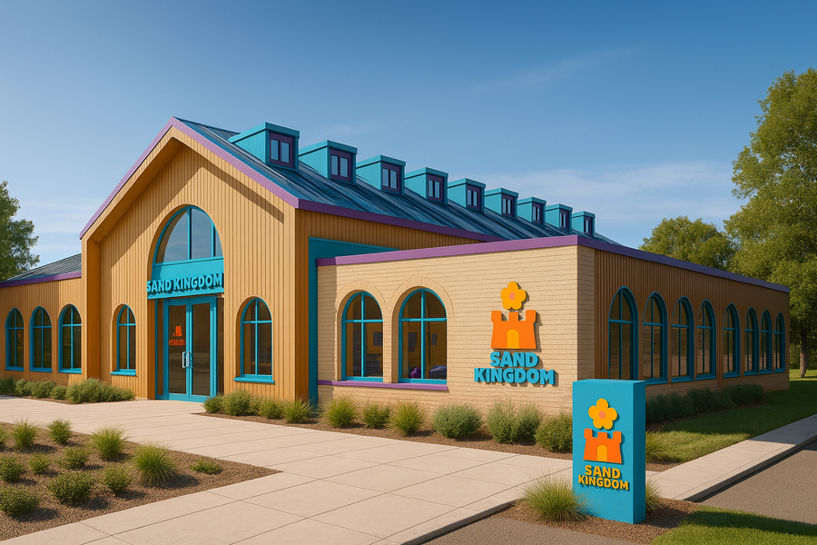 Промт, который выдал мне ChatGPT: 16:9, eye-level ¾ daylight. A calm Scandi Sand Kingdom rising like a modern sandcastle: pale sand brick and warm wood slats, teal arches catching the sky, a thin violet ribbon along the edges. Sawtooth skylights march the roof; front gable with a tall arch, side wing of repeating arches. Landscaping whispers—grasses and clean pavers. Branding is quiet: max two marks (one turquoise pylon, one wall logo). Clear blue noon, soft shadows, photoreal, spotless, no people.