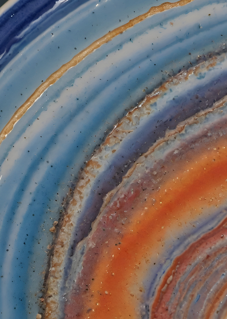 Промт: pottery with special effect glaze, ceramic, leaking, imperfections, ceramic, close up, macro, colourful, earthy tones, warm tones, top view, no perspective