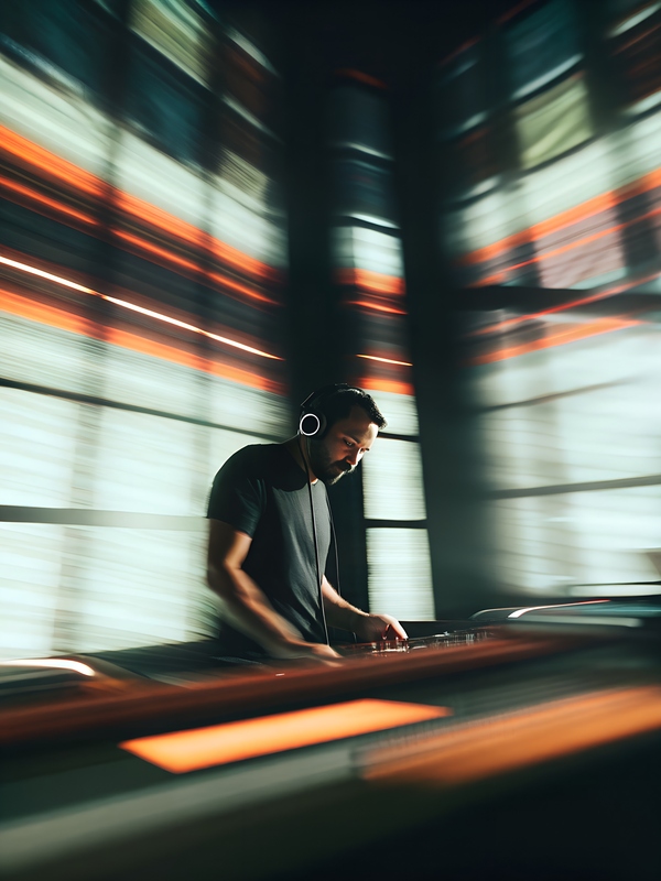 Style: Motion Blur Prompt: man listening to electronic music, in neon purple light