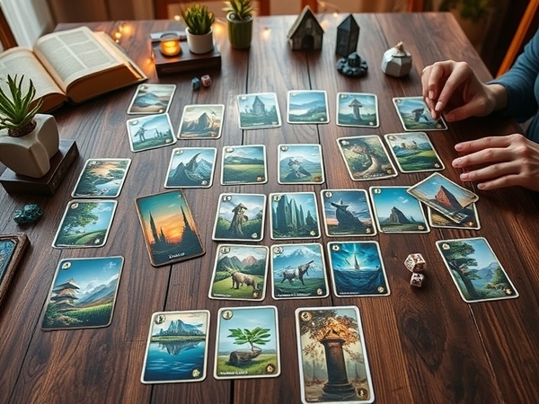 1. Card Layout: Arrange a variety of the game cards face-down and two card face-up on a rustic wooden table. Include cards featuring diverse landscapes, fantasy animals, and magical plants, showcasing the pairing aspect. Ensure that the pairs are visible and visually appealing.