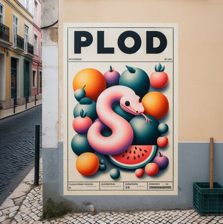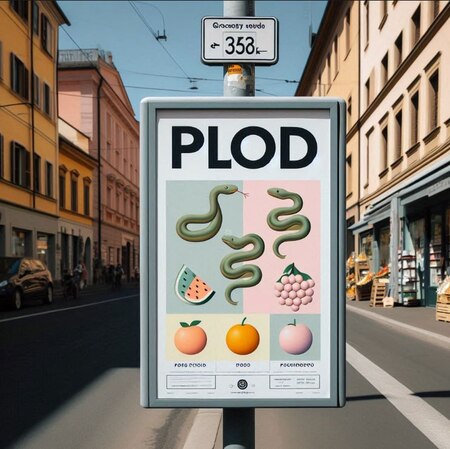 Model: Bing image creator Prompt: posters for grocery store called ‘’PLOD’’, pastel colours, minimalistic images of snakes and fruits, European streets in the background