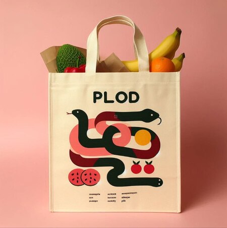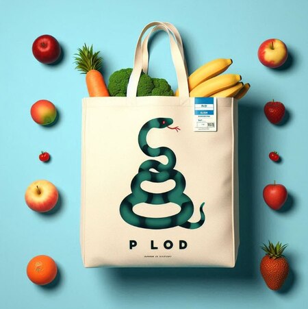 Model: Bing image creator Prompt: white shoppers for grocery store called ‘’PLOD’’, pastel colours, minimalistic images of snakes and fruits, black lettering
